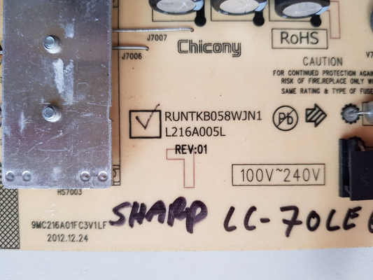 SHARP LC70LE650X POWER SUPPLY BOARD RUNTKB058WJN1 L216A005L